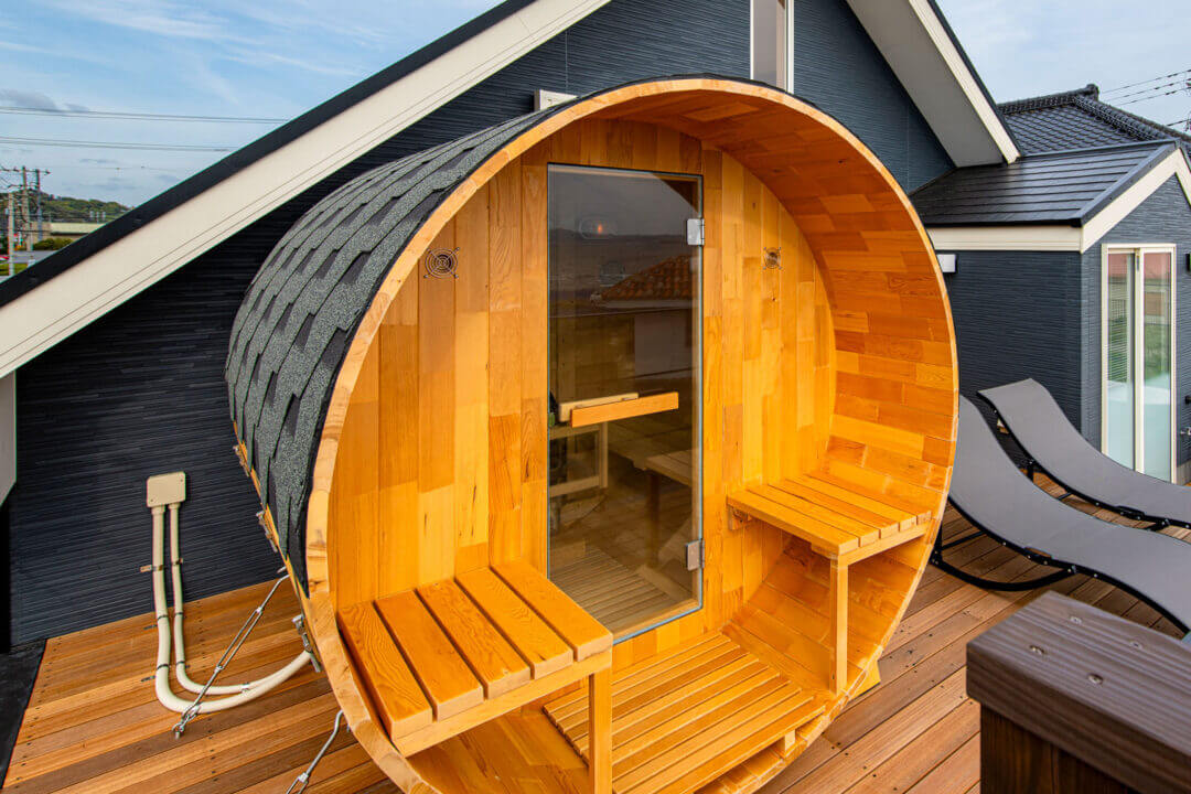 海を一望できるバルコニーにはバレルサウナを設置。1階テラスでは家族や仲間と心ゆくまでBBQがお楽しみいただけます。