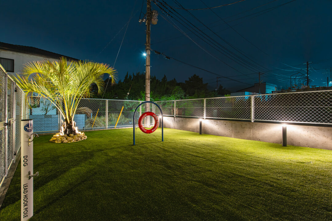 人工芝のドッグランにはアジリティと、南国のヤシの木が彩る癒しの空間。浅いプール(深さ65cm)なので、安心して水遊びを楽しめます。