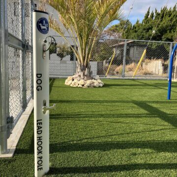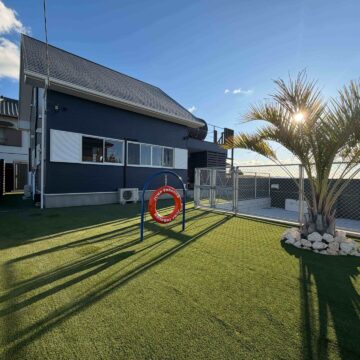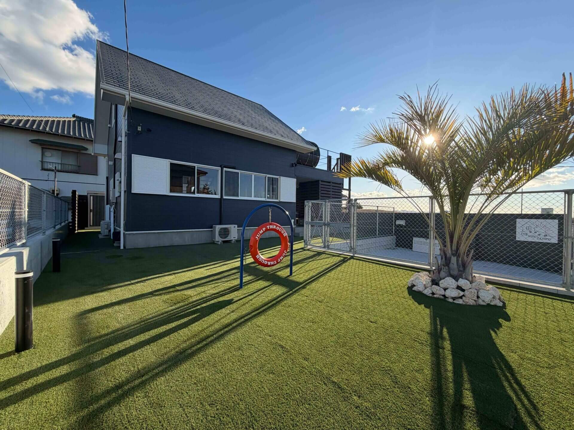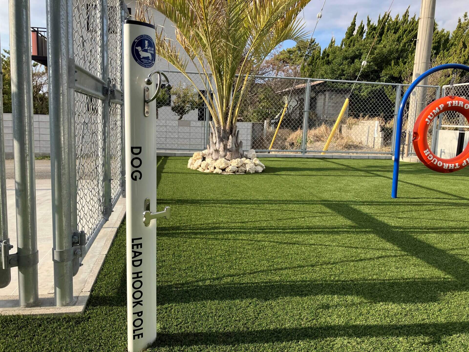 ワンちゃんが安心して走り回れる人工芝ドッグランにはアジリティ設備とヤシの木があり、お部屋には滑りにくい床材で足腰にも優しい設計です。
