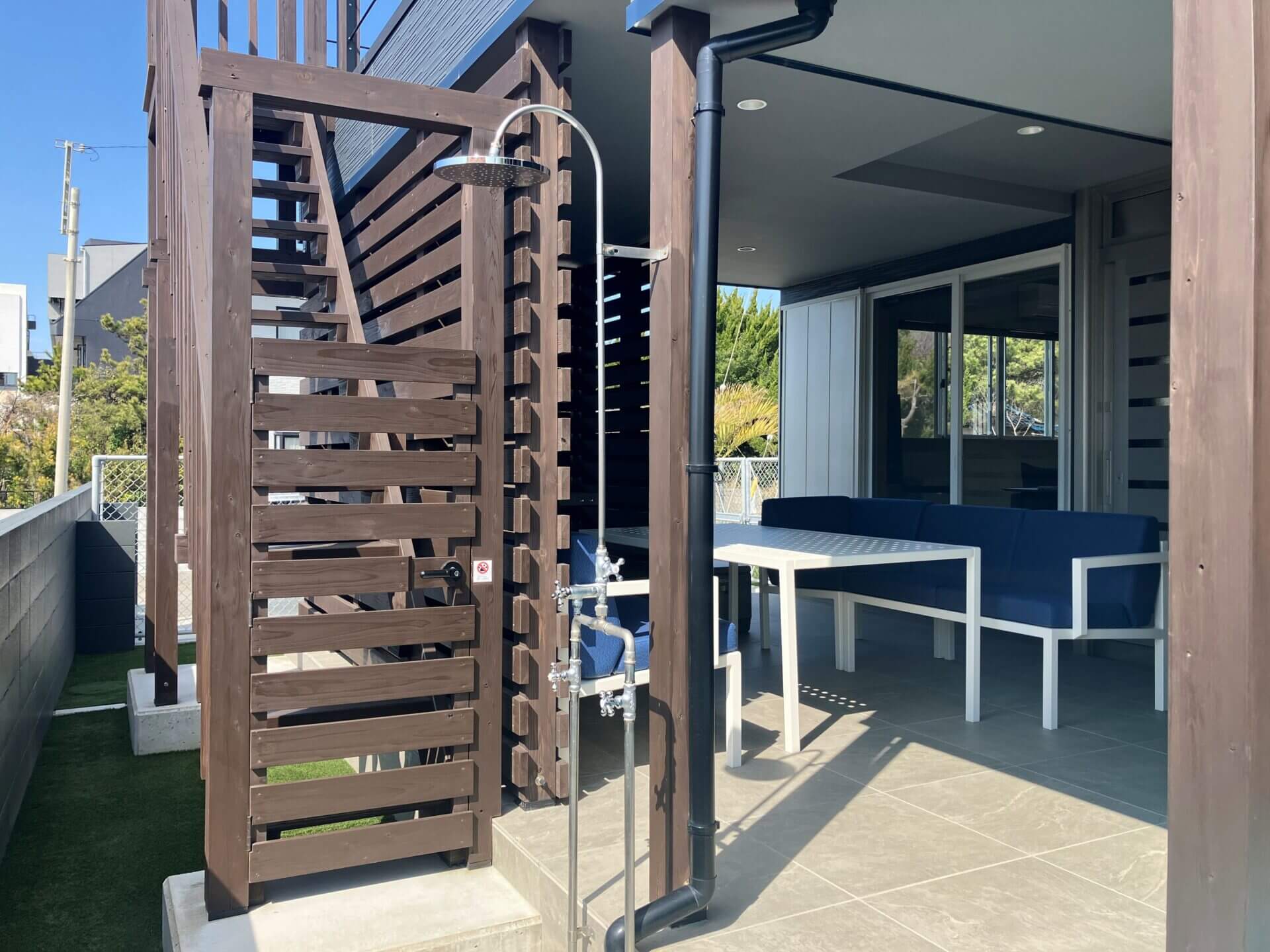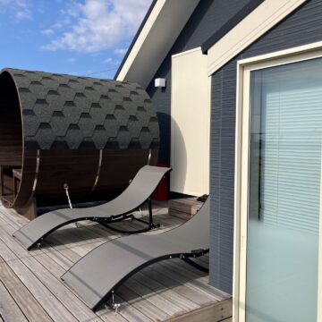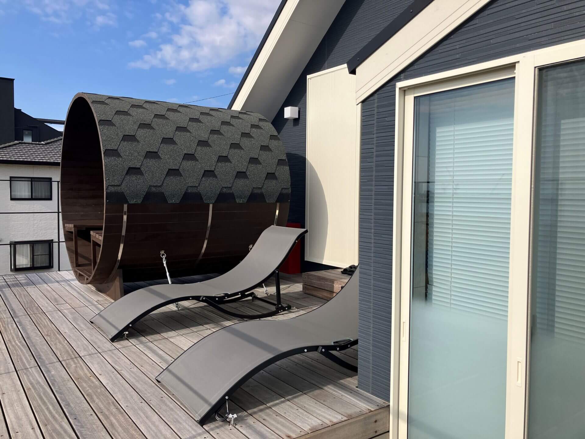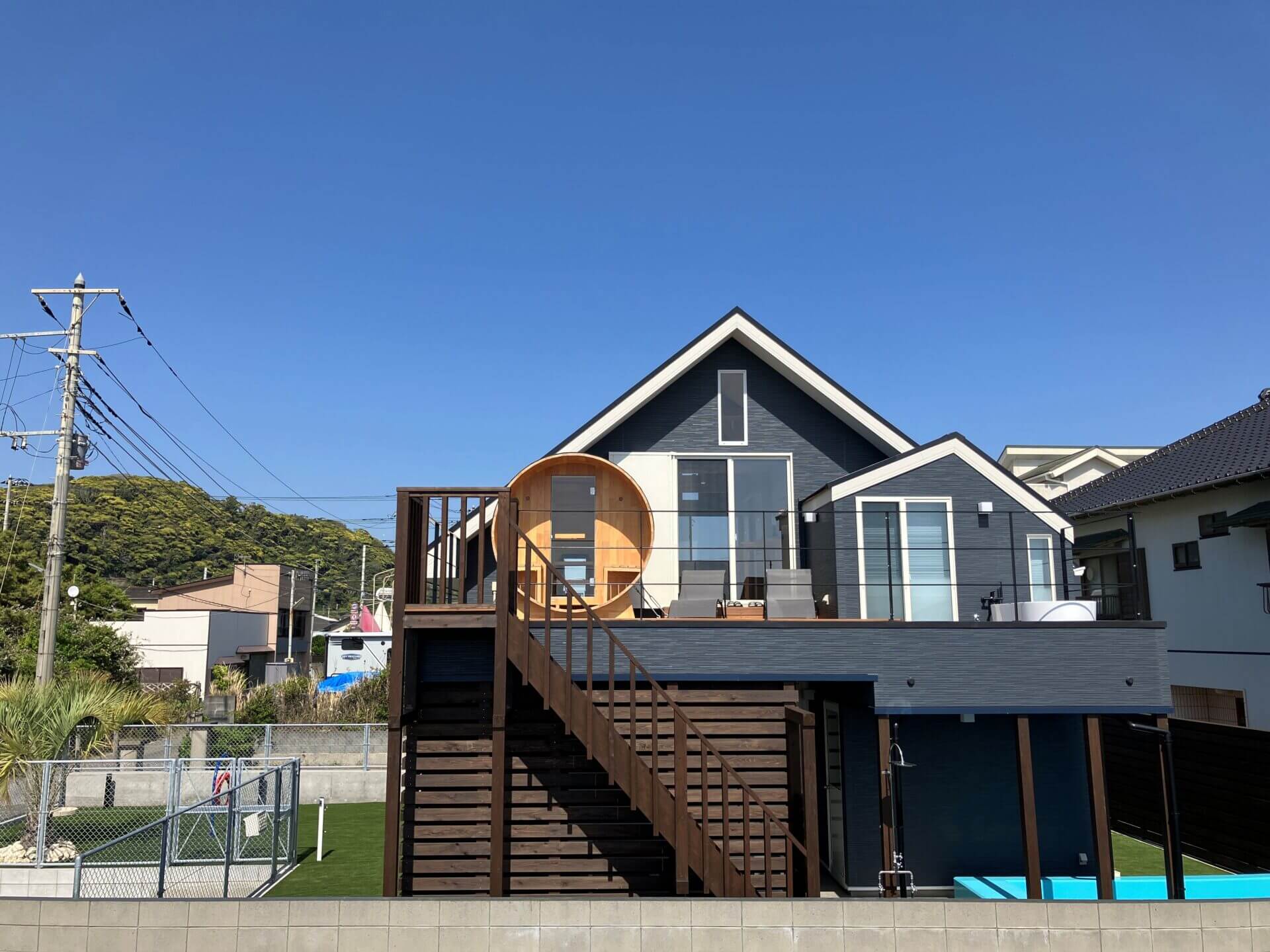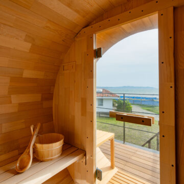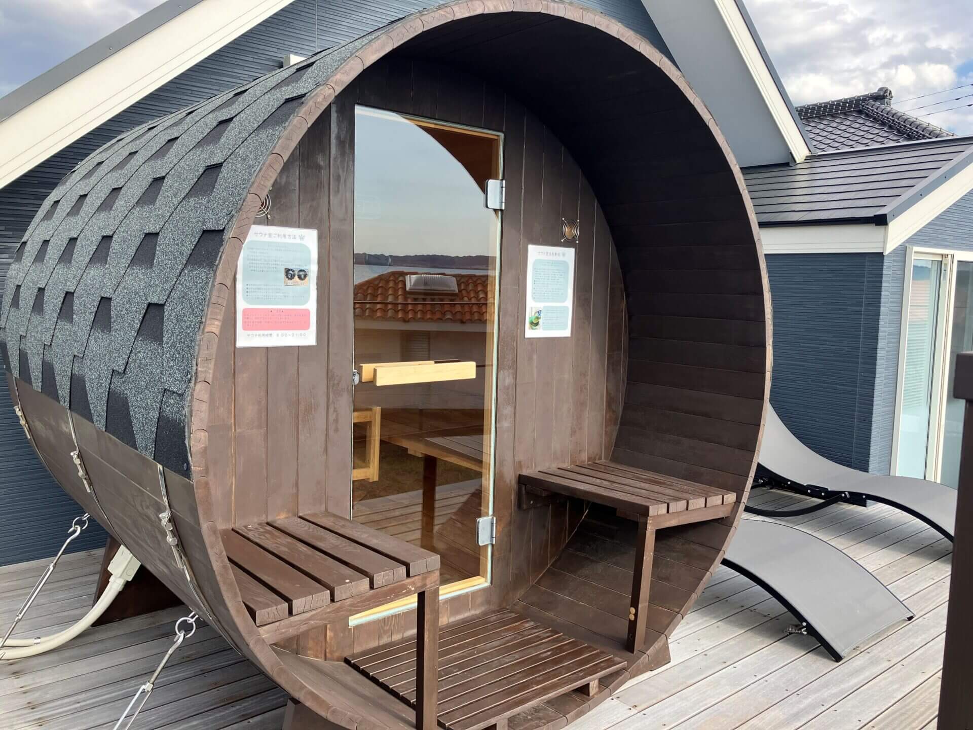 HOME > Features > SAUNA SAUNA -サウナ 公開日: 2025-05-22(2026-03-18更新) for Dog BBQ 2f-sauna-opt 2f-sauna-image01-opt 2f-balcony-bath-opt 海と空を一望する、 バルコニーに佇むプライベートサウナ 海を目の前にした2階のバルコニーにはバレルサウナと屋外バス、サンラウンジャーをご用意。 心地よい熱と冷たさ、潮風に包まれる外気浴―― ととのう贅沢を、ここでしか味わえない絶景とともに。 サウナ 天然木製バレルサウナ(ロウリュ可能)、屋外風呂(温水可)、シャワー、サンラウンジャー 屋外階段で行き来ができるバルコニー ロウリュもできる本格的な石焼サウナ サウナからのオーシャンビュー バレルサウナ 日光浴・外気浴に最適なサンラウンジャー 浴室へ直接アクセスできます 屋外階段・屋外シャワー 水風呂 for Dog BBQ