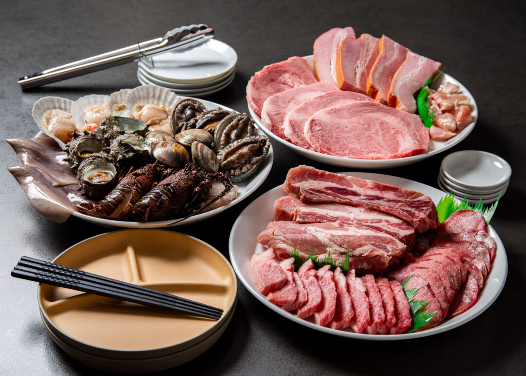 • 【肉類】国産牛ステーキ(150g)、和牛カルビ、タン、スペアリブ、厚切りベーコン、トリ肉(490g/1人前)